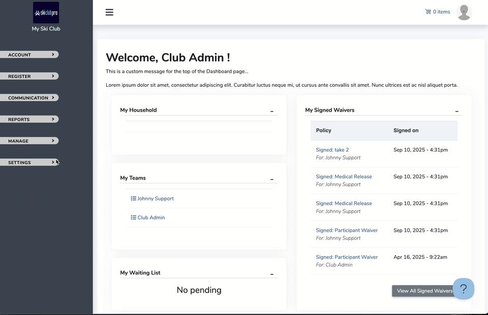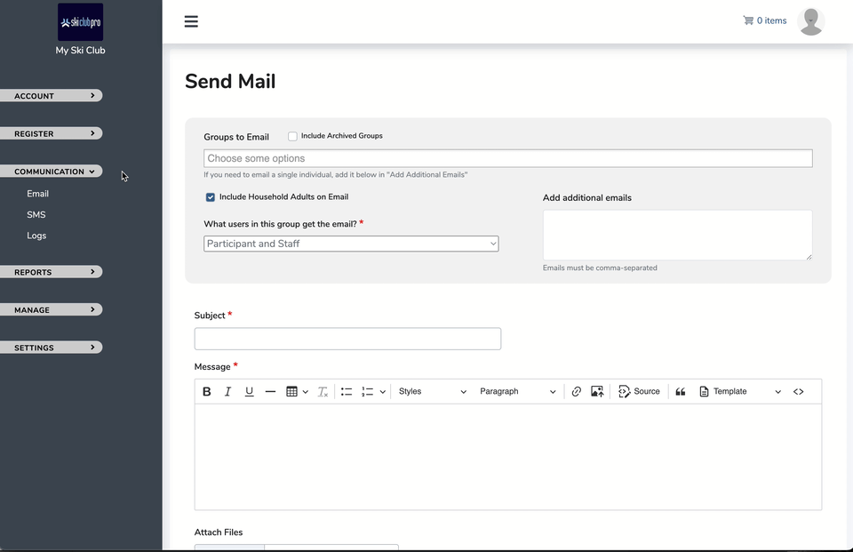 Overview: Email templates can be very helpful for a club to standardize a format or simply speed up the time it takes to create an email. As a club admin, you can create full templates or just email components that staff members can use in their email content.
